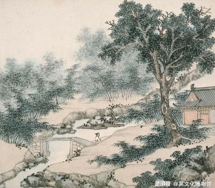 一座江南园林,如果没有桥,是不完美的,甚至是残缺的。这座折桂桥,是典型的小桥流水式的小桥,看上去一步并作两步,就能通过,让人能立马想起网师园里的那座一步桥。桥虽小,但意义深远,因为它是折挂桥。折桂一词,是从蟾宫折桂演化而来的。蟾宫,月宫也。相传蟾宫中有桂树,遂以“蟾宫折桂”谓科举应试及第,其出处见于《晋书·郤诜传》:“武帝于东堂会送,问诜曰:‘卿自以为如何?’诜对曰:“臣鉴贤良对策,为天下第一,犹桂林之一枝,昆山之片玉。”郄诜真是一个好玩的人,领导让他做一番自我评价时,他居然自夸像月宫里的一段桂枝、昆仑山上的一块宝玉。折桂一词至此而来,唐代以降,也就成为科举时代应试及第的代名词。从这样的传统寓意来考察,东庄里的这座折桂桥,自有深意。不过,桥虽以折桂而名,画的却是桥边的人生。桥边有坡堤、树木、竹林、殿宇,而画中经过折桂桥的老人,是要去大树下的哪一座殿宇呢?