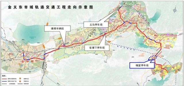 金华-义乌-东阳城际铁路由金华—义乌段和义乌—东阳(横店)段两条线路组成,金义段设塘雅车辆基地、官塘停车场,义东段设槐堂停车场、义乌停车场。