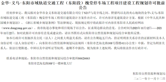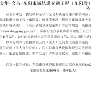 近日,东阳市人民政府门户网站发布“金华-义乌-东阳市域轨道交通工程(东阳段)槐堂停车场工程项目建设工程规划许可批前公告”,拟对槐堂停车场工程项目建筑设计方案作出许可。具体如下: