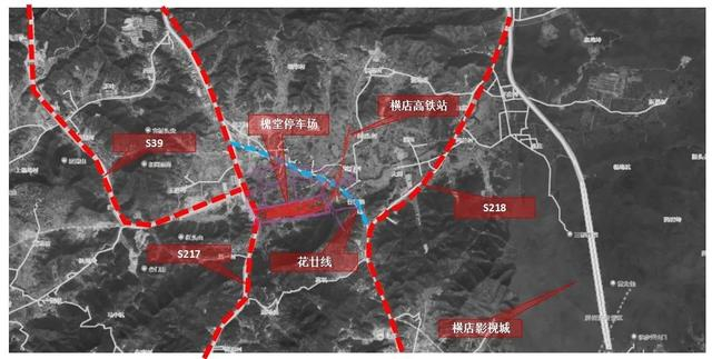 槐堂停车场选址位于S217省道与花廿线之间,南侧有野猪坞山塘,出入场线从东阳横店高铁站南侧接轨,在停车场周边规划有城市道路与主干道相连。