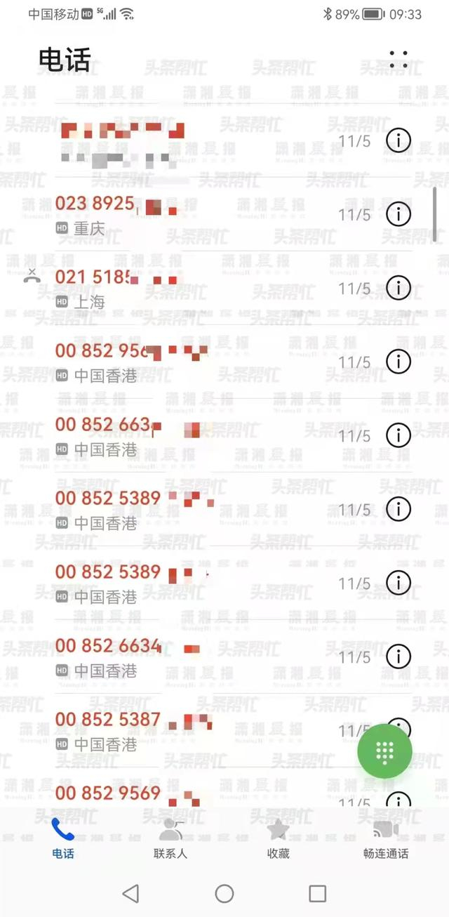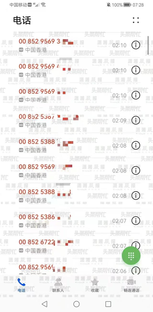 之后,方先生接到的类似电话越来越多。“每次都是不同的号码,一开始是人工语音,后来就成了智能语音,再后来变成响几声就挂掉了,简直就是骚扰电话。”记者在方先生展示的未接电话记录中看到,这些电话的号码归属地来自重庆、北京、上海以及中国香港等多地,大部分以“00852”开头。