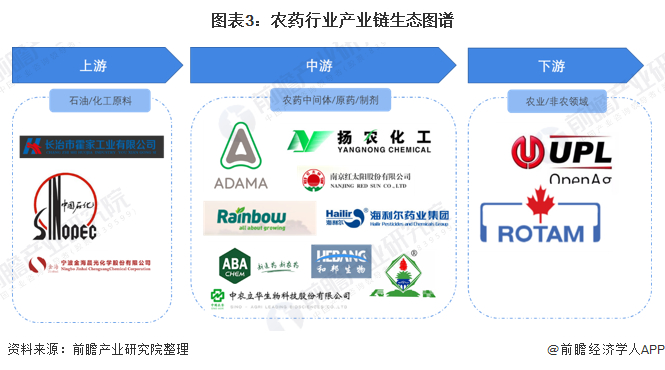 农药行业上游相关企业主要有长治市霍家工业有限公司、中国石化上海石油化工股份有限公司、宁波金海晨光化学股份有限公司等。中游的参与企业一般都涵盖了农药中间体、原药、制剂等,主要参与者有安道麦、扬农化工、润丰股份等。产业链的下游主要分布在农林牧渔领域。