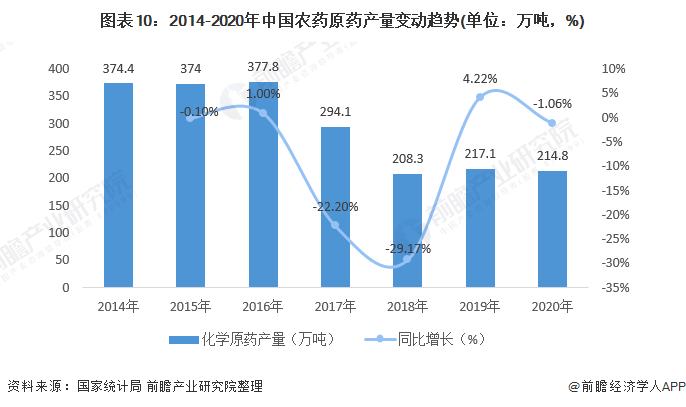 随着农业农村部“到2020年实现化肥、农药使用量零增长”政策的实施,特别是高毒有机磷农药品种(其中绝大部分为杀虫剂)被逐步淘汰,农药总产量稳步下降。国家统计局数据显示,2020年农药行业规模以上企业化学农药原药(折100%)产量为214.8万吨,同比减少1.06%。