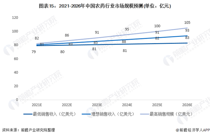 从需求端来看,受益于我国农药行业经营结构的不断改善和行业集中度的不断上升,国家统计局数据显示近年来我国农药行业规模以上企业主营业务稳步增加,未来一段时间,我国农药行业发展仍将面临相对较好的市场环境。在良好的市场环境的作用下,农药行业将保持稳定发展,但是发展增速会趋于平缓。在2021-2026年间,若以5%作为我国农药行业销售收入年均增长率的上限,以1%作为我国农药行业销售收入年均增长率的下限,以3%作为我国农药行业销售收入年均增长率的理想速度。那么,到2026年,我国农药行业最高销售收入约为105亿美元,最低销售收入约为83亿美元,理想销售收入约为93亿美元。