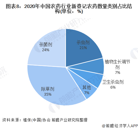 2020年新增农药登记中,除草剂登记数量为298个,占比35.14%;杀菌剂登记数量为203个,占比23.94%;杀虫剂登记数量为179个,占比21.11%;植物生长调节剂登记数量为59个,占比6.96%;卫生杀虫剂登记数量为53个,占比6.25%;其他农药类别如杀螨剂、杀鼠剂等登记数量为56个,占比6.6%。