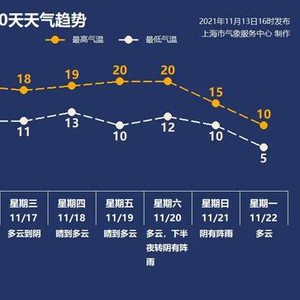 上海市金山区气象局2021年11月14日06时发布的天气预报:今明天晴到多云。西南风,明天转南到东南风,风力都是3-4级。今天最高温度20度,明天最低温度8度。实况:昨天最高温度18.4℃,今晨最低温度6.6℃。