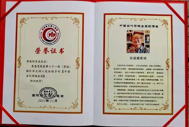 11月13日,第21届(清远)国际华文诗人笔会在线上举行。中国作家协会副主席、诗人吉狄马加出席,笔会主席、中国香港诗人张诗剑致开幕词,常务主席峭岩主持会议。笔会授予诗人、诗评家吕进“中国当代诗魂金奖”,这是“中国当代诗魂金奖”第二次颁授给华文诗歌评论家。