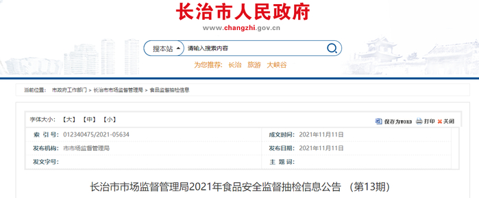 中国质量新闻网讯 据山西省长治市人民政府网站2021年11月11日消息,长治市市场监督管理局发布2021年食品安全监督抽检信息公告(第13期)。