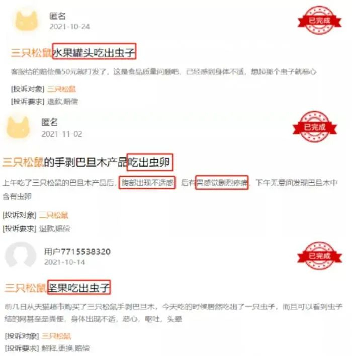 黑猫投诉平台上有大量关于三只松鼠的投诉,涉及产品发霉变质、长毛,还有“水果罐头吃出虫子”,巴旦木产品“吃出虫卵”……