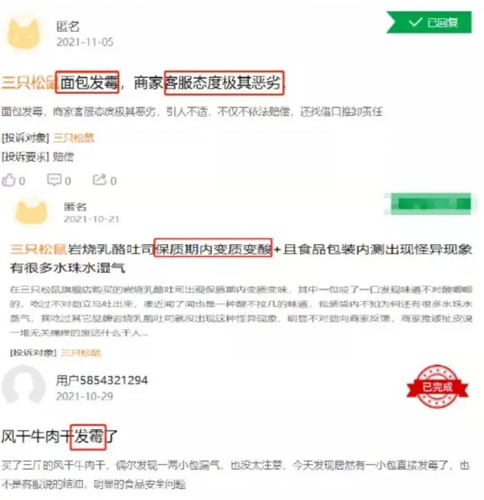 据媒体统计,仅10月以来三只松鼠在微博、黑猫投诉等多个网络平台的投诉就达到数十起,几乎涉及烘焙系列(面包、吐司)、坚果(巴旦木、夏威夷果等)、牛肉干、水果罐头等全系产品,问题主要有发霉、长毛、吃出虫卵等。