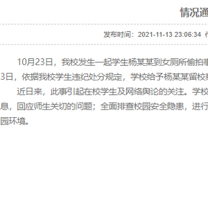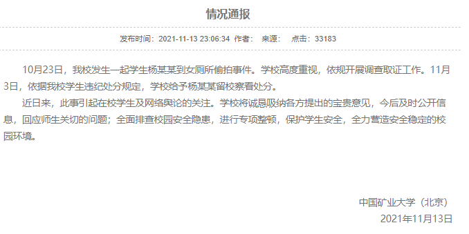 据中国矿业大学(北京)官网13日发布的情况通报,10月23日,该校发生一起学生杨某某到女厕所偷拍事件。学校高度重视,依规开展调查取证工作。11月3日,依据该校学生违纪处分规定,学校给予杨某某留校察看处分。
