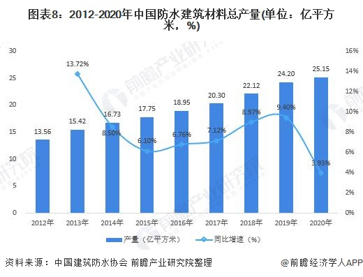根据中国建筑防水协会的相关数据,2012-2020年,中国防水建筑材料产量逐年上升,由13.56亿平方米增长至25.15亿平方米。2020年,防水建筑材料产量25.15亿平方米,由于疫情的影响,增速有所放缓,并呈现前低后高态势。