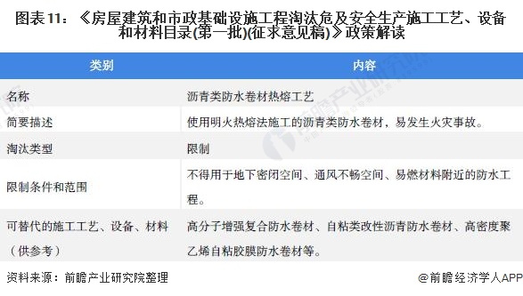 2021年7月,国家住建部发布《房屋建筑和市政基础设施工程淘汰危及安全生产施工工艺、设备和材料目录(第一批)(征求意见稿)》。其中,沥青类防水卷材热熔工艺为限制类施工工艺,可替代的施工工艺、设备、材料有高分子增强复合防水卷材、自粘类改性沥青防水卷材、高密度聚乙烯自粘胶膜防水卷材等。