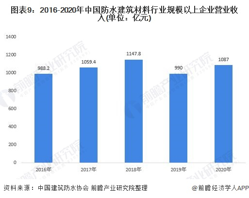 2、规模:2020年中国防水建筑材料行业规模以上企业营业收入达到1087亿元