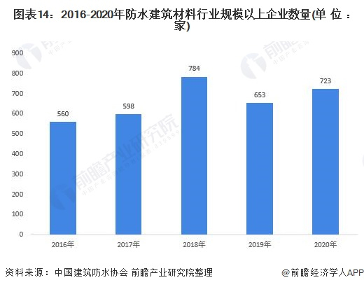 根据中国建筑防水协会统计数据,2016-2020年防水建筑材料规模以上企业数量波动上升,2018年规模以上防水企业数量达到784家,为近年来的最高值;2019年规模以上防水企业数量为653家,2020年达到723家。