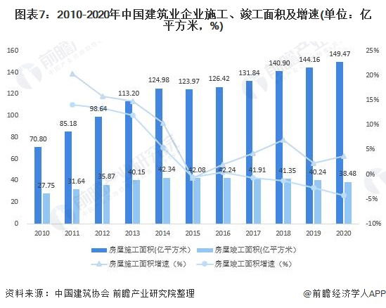 2020年,全国建筑业企业房屋施工面积149.47亿平方米,比2019年同比增长3.68%,增速比2019年提高了1.36个百分点;竣工面积38.48亿平方米,连续四年下降,比2019年下降4.37%。