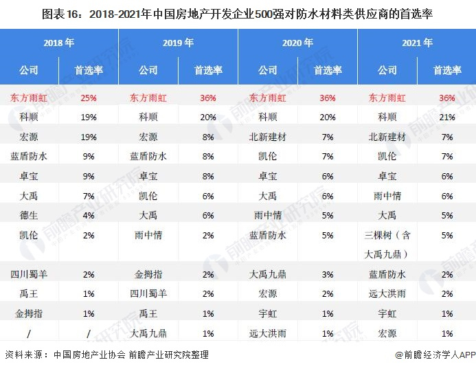 根据中国房地产业协会披露的相关数据,2018-2021年,东方雨虹均获评2020中国房地产开发企业500强首选供应商服务商品牌,首选率位于行业第一,“东方雨虹”品牌已经成为中国建筑防水行业公认的优质品牌。其余领先品牌有科顺、北新建材、凯伦、卓宝、雨中情等。