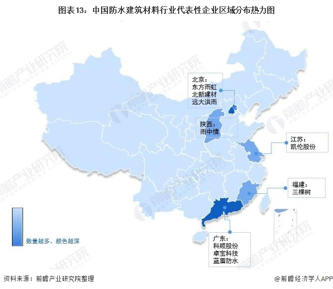 从代表性企业区域分布看,防水建筑材料行业内领先企业东方雨虹、北新建材、远大洪雨均位于北京;科顺股份、卓宝科技和蓝盾防水位于广东省内;凯伦股份、雨中情、三棵树分别位于江苏、陕西和福建。