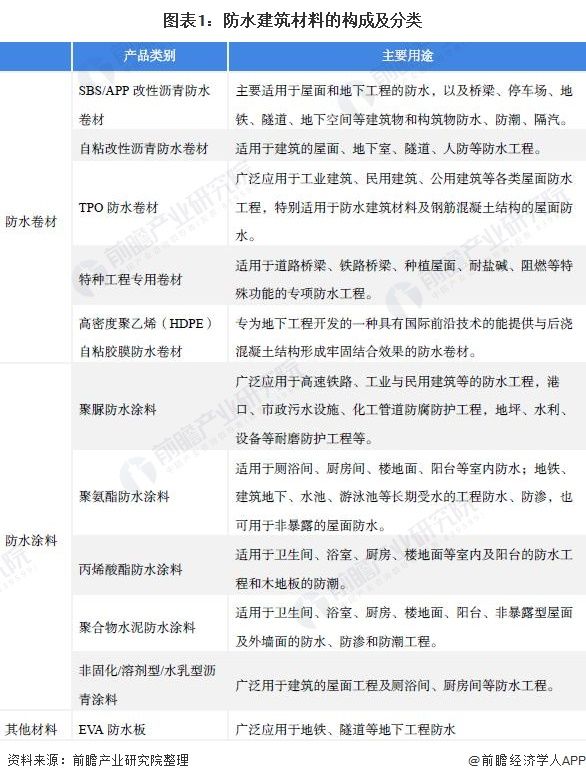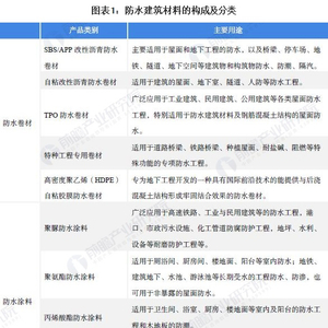 防水建筑材料是防止雨水、地下水、工业和民用的给排水以及空气中的湿气、蒸汽等侵入建筑物的功能性材料。从产品划分来看,目前建筑防水材料主要为防水卷材和防水涂料。具体包括SBS/APP改性沥青防水卷材、高分子防水卷材、防水涂料、自粘防水卷材、沥青复合胎柔性防水卷材等。其中,应用最广泛的是改性防水卷材、高分子防水卷材、防水涂料和自粘防水卷材。