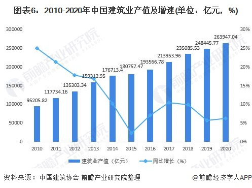 近年来,随着我国建筑业企业生产和经营规模的不断扩大,建筑业总产值持续增长,2010-2020年,中国建筑业总产值由9.52万亿元增长至26.39万亿元。2020年,中国建筑业产值达到263947.04亿元,比2019年增长6.24%。