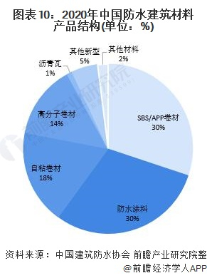 根据中国建筑防水协会数据,2020年,我国防水建筑材料的产品中的SBS/APP卷材占比为30%,自粘卷材占比为18%,SBS/APP卷材和自粘卷材均属于沥青基卷材。高分子卷材和沥青瓦占比分别为14%和1%,防水涂料的占比为30%。