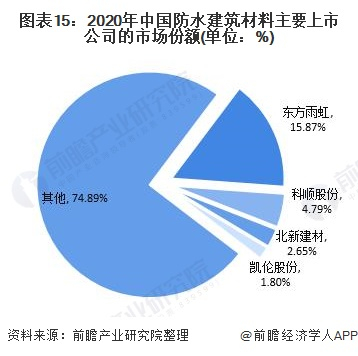 目前,国内建筑防水行业集中度较低、市场较为分散、竞争不够规范,“大行业、小企业”依旧是行业发展标签。根据相关上市公司的防水建筑材料业务营业收入占中国防水建筑材料行业规模以上企业营业收入的比例计算得到其市场份额。东方雨虹的市场份额达到15.87%,为行业第一。