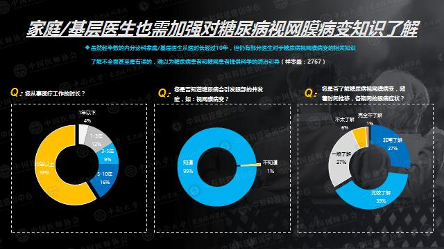 不仅如此,家庭/基层医生也需要加强对糖尿病视网膜病变知识的了解。《报告》显示,虽然超半数的内分泌科家庭/基层医生从医时长超过10年,但仍有部分医生对于糖尿病视网膜病变的相关知识了解不全面甚至是有误的,难以为糖尿病患者和糖网患者提供科学的防治引导。