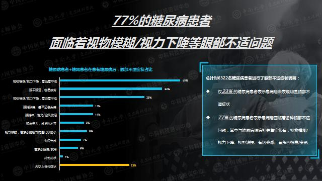《报告》显示,在此次参与调研的患者中,就有约77%的患者因为患上糖尿病后,继而出现了视物模糊、视力下降等眼部不适问题。