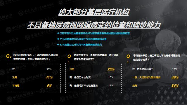 权威数据显示,目前我国87%的糖尿病患者大多就诊于县级及以下医疗机构,但这类医疗机构却往往不具备糖网诊疗能力。《报告》显示,在此次接受调研的基层医生和医疗机构中,有75%的单位没有相关检查设备,并且具备确诊病情能力的医疗机构仅有18%。