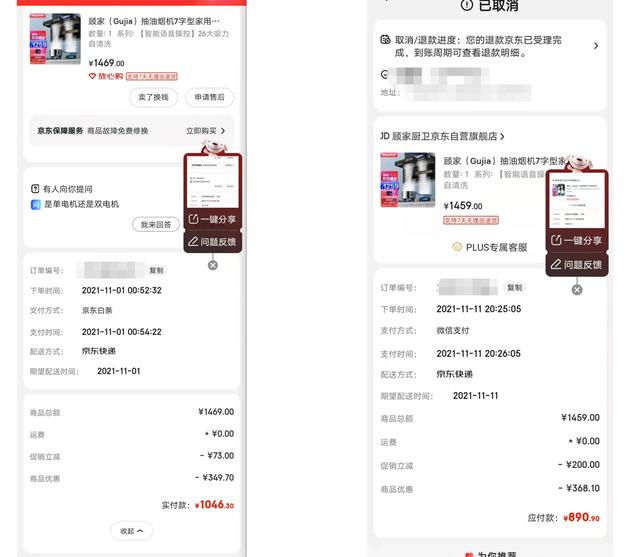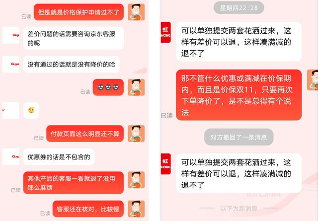王先生说,他又联系京东平台客服,但客服通过计算表示,差价155元的抽油烟机,退还109元,差价70元的花洒仅退还28元,“我买了两套花洒,单单是这3件产品的差价,依然少退了130元,但客服说只能退那么多,如果不同意就不能申请了”。