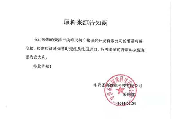 2021年1月份,公司收到来自华润圣海的告知函:生产所用的原料从法国进口葡萄籽更换成意大利进口葡萄籽原料,公司根据所获悉的最新的原料变动信息第一时间修正了产品宣传内容,已将所有自营渠道的对外宣传页面进行了修订更新,该原料变更信息准确真实,不存在虚假宣传。