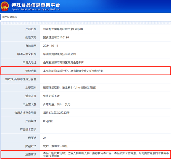 “益普利生牌葡萄籽维生素E软胶囊(国食健字G20110126)”为2011年01月28日批准的保健食品,有效期至2016年01月27日。2014年10月29日产品名称变更为“葡萄籽维生素E软胶囊”,2019年10月12日批准该产品延续注册并同时更名为“益普利生牌葡萄籽维生素E软胶囊(国食健注G20110126)”。