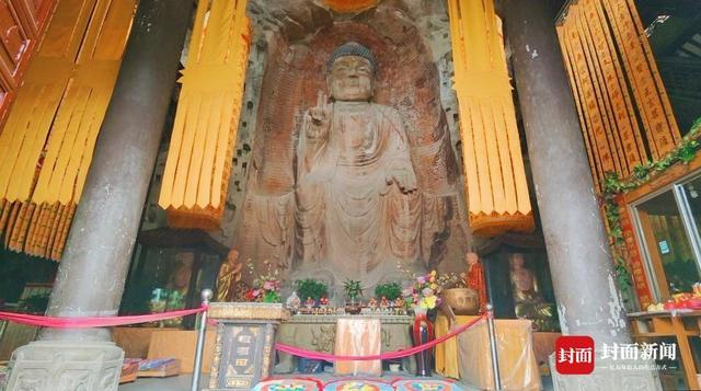 孙娜介绍,大像山摩崖造像以阆中大佛为中心开凿,其中药师殿4龛,大佛寺内有7龛,其余造像龛分布在大像的右侧约50米处,药师殿和大像龛外面建设有楼阁保护。
