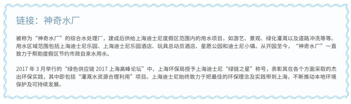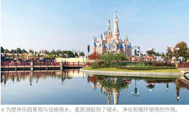 上海迪士尼乐园场地内雨水也储存在“星愿湖”中,通过度假区综合水处理厂处理水质,专门供给乐园使用。