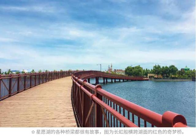星愿湖的诸多桥梁作为交通设施,其景观亦令人叹为观止。由西门进入星愿公园,就能看见一座红色的奇梦桥如长虹般横跨湖面,弧线的桥面形式,使游人可以多角度观赏湖景以及乐园酒店、申迪文化中心等建筑景观。