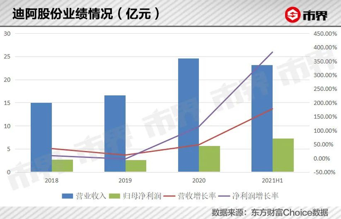 2020年,迪阿股份的营业收入已经达到了24.64亿元,归母净利润为5.63亿元。2021年上半年,业绩出现暴增,营收达到了23.2亿元,快追上去年全年的水平了,而归母净利润已经超过了去年全年,为7.29亿元。
