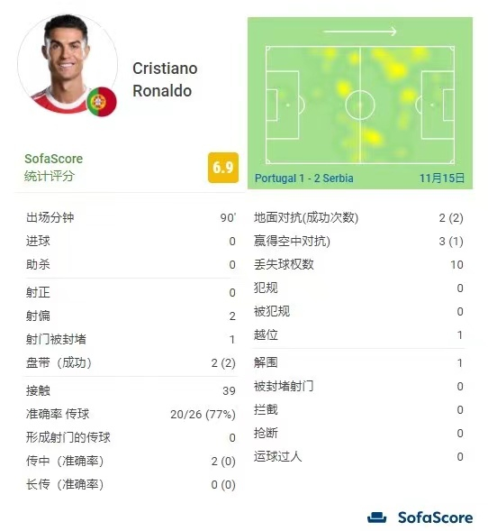 从本场比赛的数据统计来看,C罗只能说是表现平平。C罗赛后获SOFASCORE网6.9分的评分,这是一个中等的分数,毕竟你不能指望一个球员的表示时时刻刻都在巅峰状态,而且这名球员已经36岁。数据显示,本场比赛C罗踢了90分钟,没有进球和助攻,他有3次射门但都没有射正。值得一提的是,C罗全场只有39次触球,这是一个比较低的数据,从比赛热区图可以看出他在禁区的时间并不多。