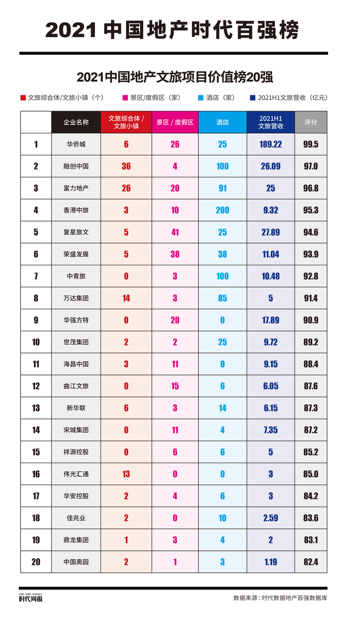 11月10日,时代传媒2021中国地产时代百强榜的子榜《2021中国地产文旅项目价值榜20强》榜单(下称《榜单》)出炉,依托时代传媒旗下的时代数据地产百强数据库,以地产企业在文旅项目上的布局及其环境影响力、运营方面和发展前景综合打分,持续关注文旅地产的未来发展方向。