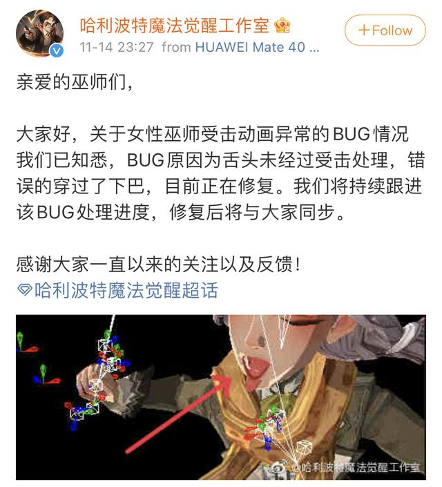 14日晚,《哈利波特:魔法觉醒》工作室微博账号回应称,女性巫师受击动画异常系BUG,因为舌头未经过受击处理,错误地穿过了下巴。15日,游戏工作室称,动画异常已修复,请不要对模型BUG作其它解读。