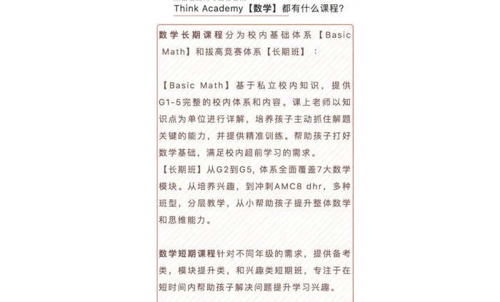 Think Academy官网及官微信息显示,其提供数学与中文课程,并有试听课,师资来自世界顶尖高校,多数有竞赛获奖经历。