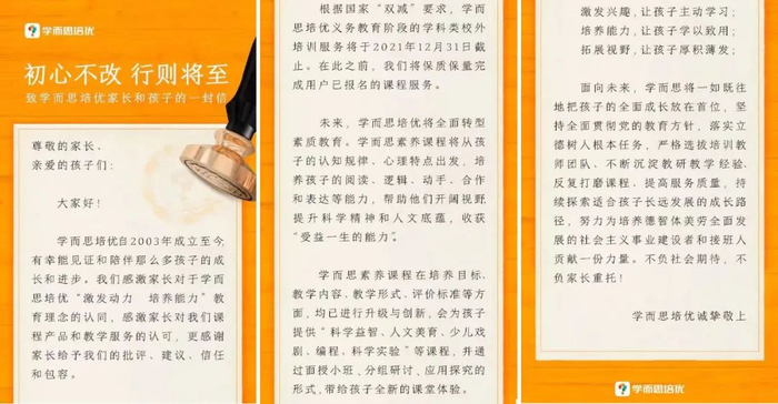 在内部信中,张邦鑫提到,业务重心从原来“学习改变命运”的学科培训,转变为培养孩子“受益一生的能力”的素质培养。