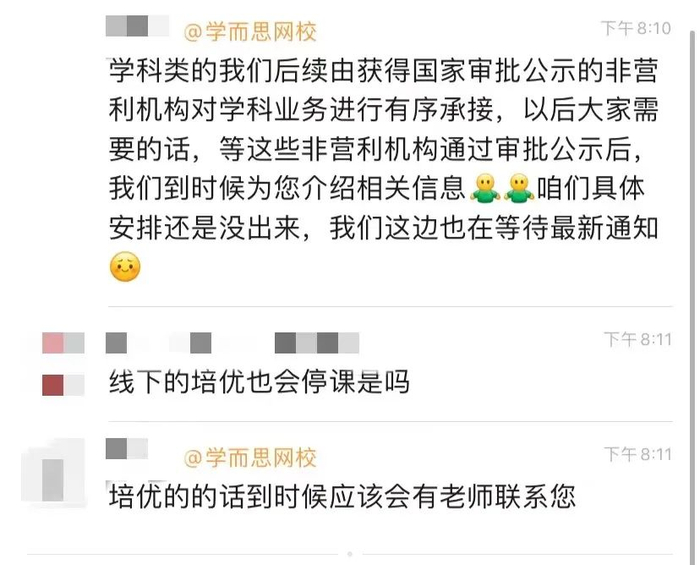 她的孩子已在学而思网校上了2年小学英语科目,老师在沟通中透露,学科类培训后续会由获得国家审批公示的非营利机构来承接。