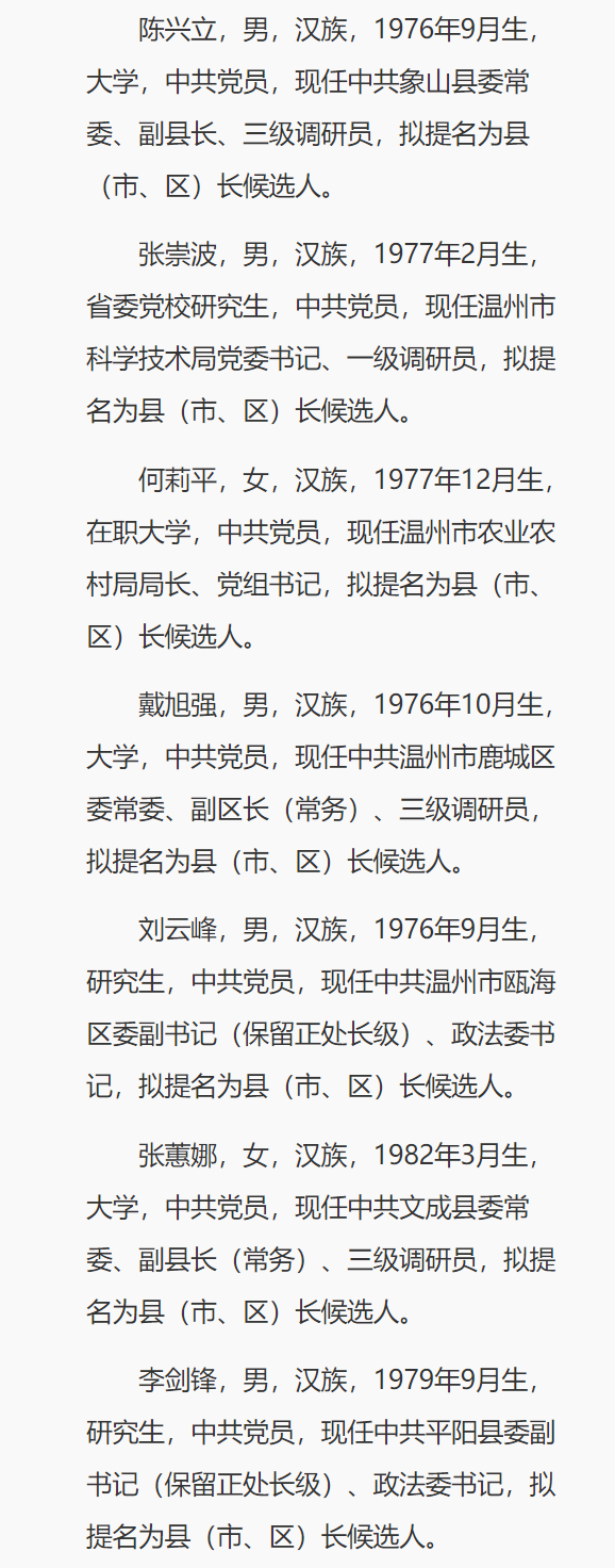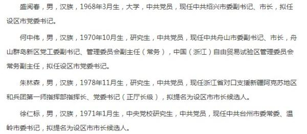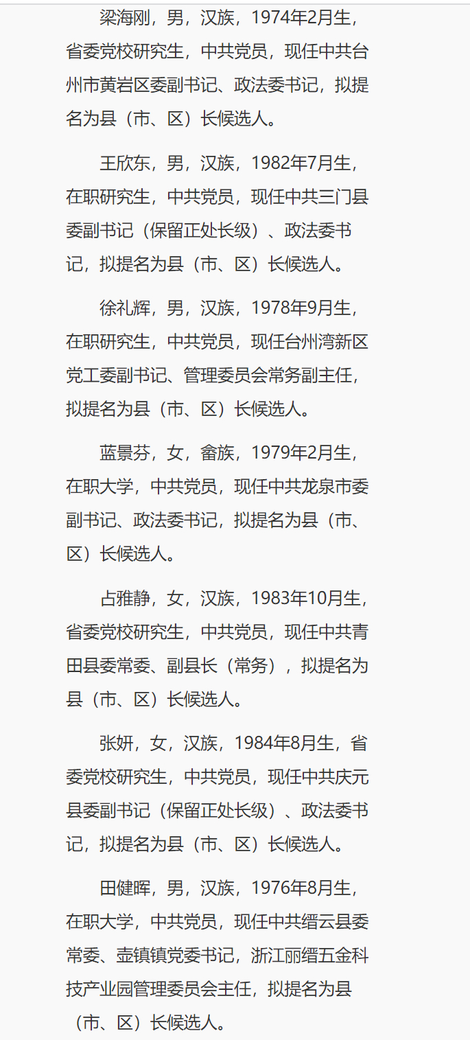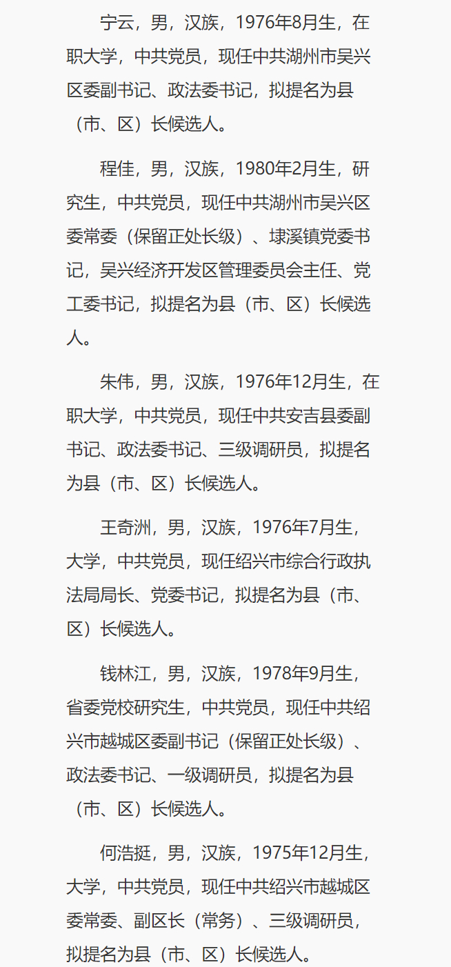 其中,今年43岁的朱林森是江苏姜堰人,曾任平湖市市长、共青团浙江省委书记等职,现任浙江省对口支援新疆阿克苏地区和兵团第一师指挥部指挥长、党委书记(正厅长级),拟提名为设区市市长候选人。他曾一度是浙江省最年轻的县(市、区)长。