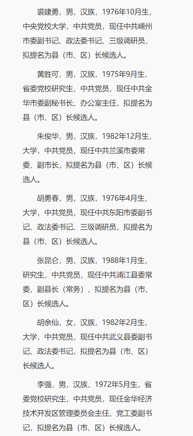 其中最年轻的是出生于1988年的张昆仑,现年33岁,现任中共浦江县委常委、副县长(常务)。
