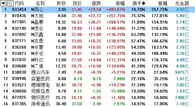 北交所81家首批上市公司开市首日换手率前16名 来源:同花顺