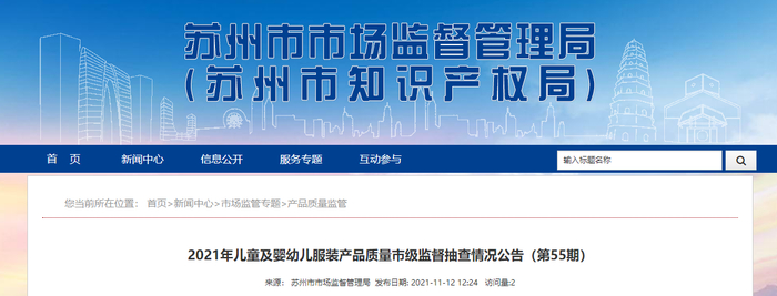 中国质量新闻网讯 11月12日,江苏省苏州市市场监督管理局网站发布《2021年儿童及婴幼儿服装产品质量市级监督抽查情况公告(第55期)》。