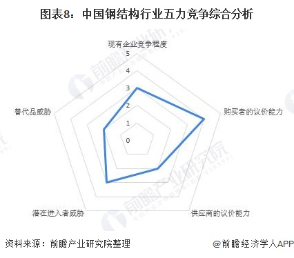 运用波特的“五力”模型,对钢结构行业的竞争环境分析中,对各方面的竞争情况进行量化,5代表最大,0代表最小,钢结构行业的竞争情况如下图所示: