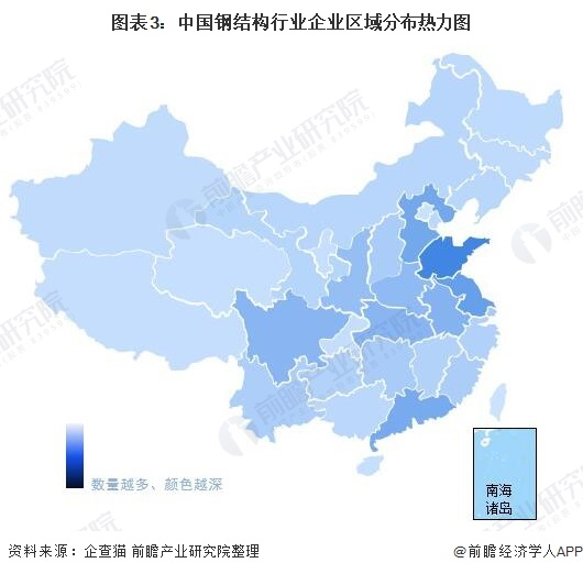 在企查猫平台以“钢结构”为关键词进行检索,数据显示,我国钢结构行业生产企业数量较多,但企业规模较小。通过对企业所在地进行汇总可知,我国山东省、安徽省、江苏省钢结构生产企业相对较多。整体来看,我国钢结构生产企业区域分布相对集中。