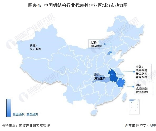 从代表性企业区域分布看,钢结构行业内领先企业鸿路钢构、精工钢构和富煌钢构均位于安徽省内;浙江省主要代表企业有东南网架、杭萧钢构;北京市主要代表企业有森特股份;湖北省主要代表企业有海波重科;新疆省主要代表企业有光正眼科。