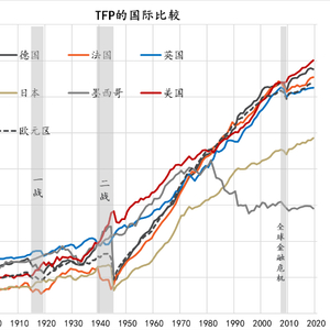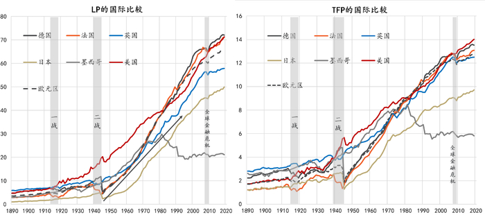 近130年来,LP累积增长的排名为:日本(47倍)、法国(24倍)、德国(15倍)、美国(15倍)和英国(10倍);TFP累积增长的排名为:法国(11倍)、美国(8倍)、日本(7.8倍)、德国(6倍)和英国(4倍);人均GDP累积增长的排名为:日本(25倍)、美国(13倍)、法国(11倍)、德国(9倍)和英国(7倍);20世纪60年代以前,所有国家人均GDP与TFP的增长轨迹都高度重叠,法国则一直持续至今,欧元区作为一个整体一直持续到20世纪80年代中期。